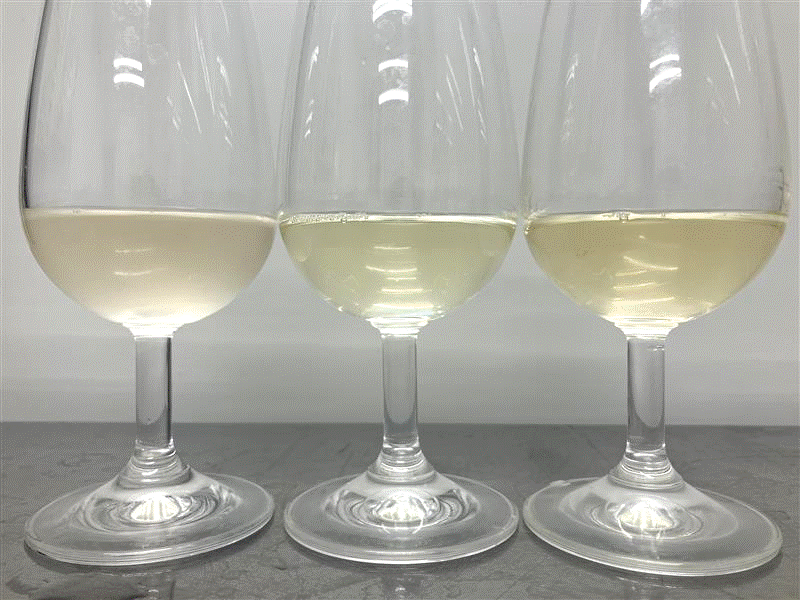 まほろばスパークリング(シャルドネ、アルバリーニョ)の清澄安定化テストを行いました。清澄安定化はワインの濁り成分を除去する目的で行い、白ワインの濁り成分の除去にはベントナイトを使用します。ベントナイトは濁り成分の他に味わい成分も除去してしまうため、テイスティングも同時に行います。テイスティングでは、香りがとても良いとの意見も頂くことができたので、良い香りや味わいを残せられるよう調整していきます。美味しいワインができるように頑張ります!