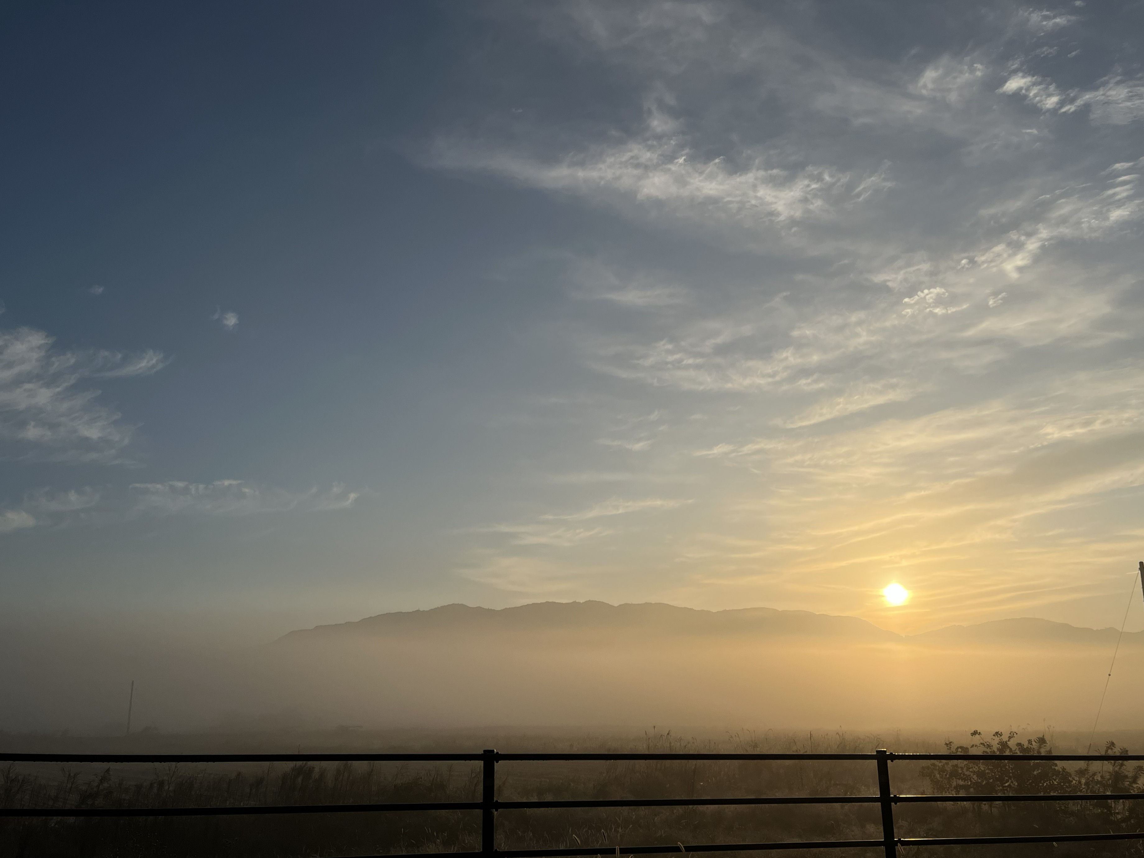 11月中旬になると盆地特有の霧が発生する日があります。これは高気圧に覆われて風が弱い日の明け方に、地面が冷やされて大気中の水蒸気が凝結することによる現象です。放射冷却が起こる日は、早朝に強い冷え込みを感じますが、外に出て近くの山を眺めると、霧の中に山頂が浮かんでいるような、とても壮大な景色を見ることができます。