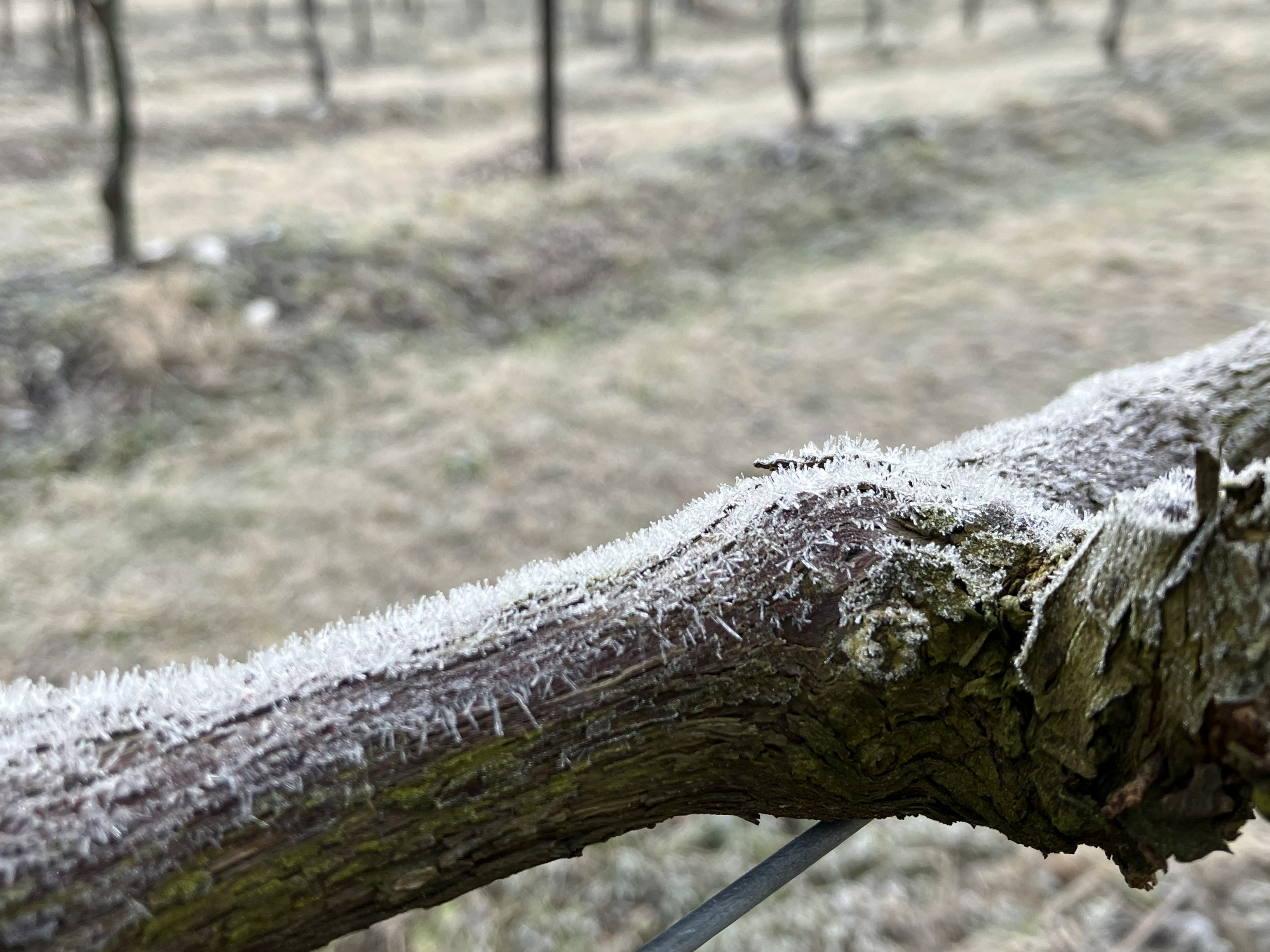 葡萄畑で樹霜(じゅそう)が見られる季節になりました。樹霜は、大気中の水滴が樹木や草木に付着して凍りつくことによりでき、針状の結晶が特徴です。冬の朝に樹霜に覆われた葡萄の樹が、ようやく昇ってきた太陽に照らされてキラキラ輝く様子は絶景です。